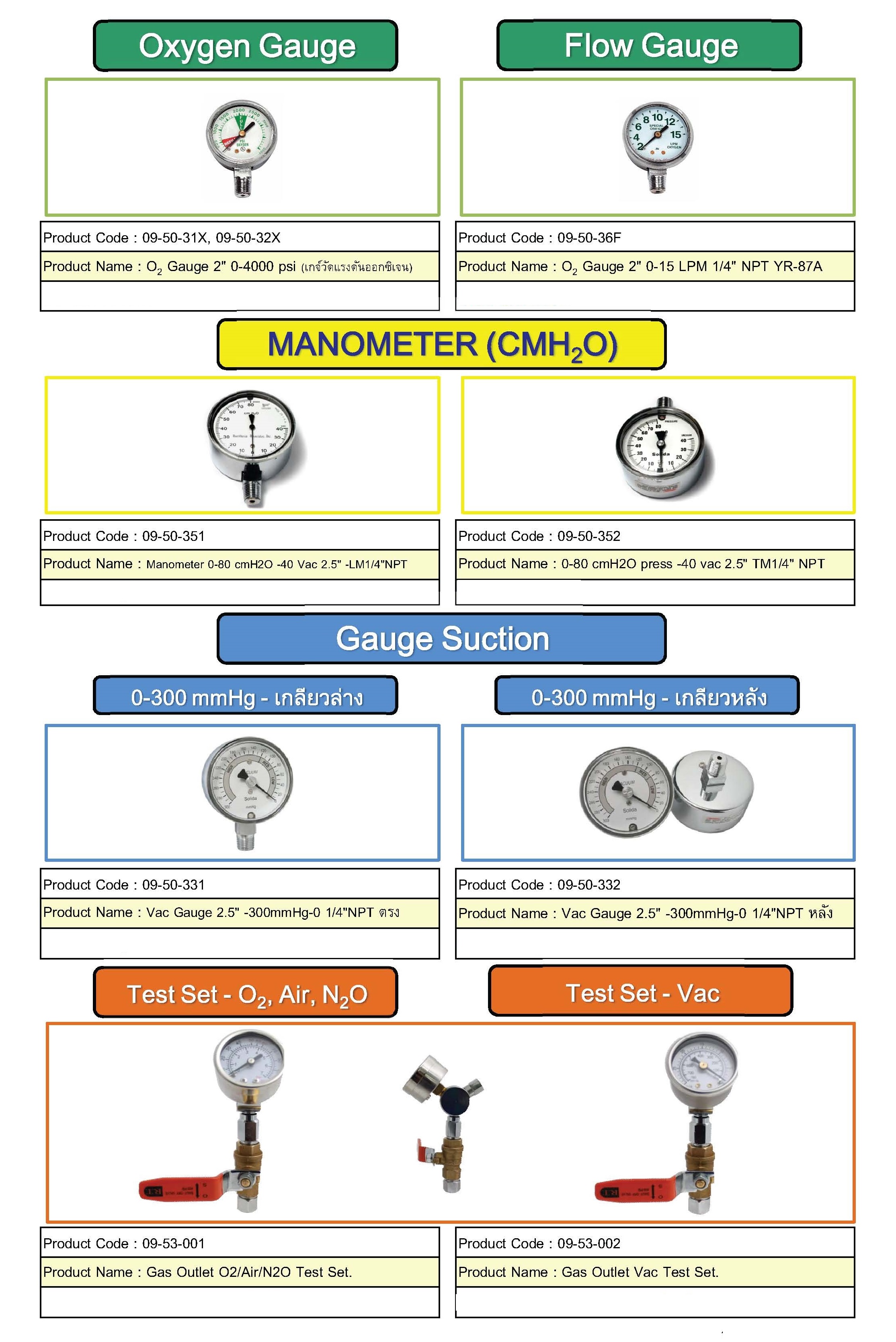 Medical Gas Gauge Hospital Gas Gauge เกจวัดความดันก๊าซทางการแพทย์ชนิดต่างๆ เกจวัดความดันเกจ์วัดอัตราการไหลของก๊าซทางการแพทย์ชนิดต่างๆ ได้แก่ Oxygen Gauge O2 Cylinder Gauge, O2 Pipeline Gauge ออกซิเจนเกจ เกจ์วัดความดันถังออกซิเจน เกจวัดความดันก๊าซออกซิเจนในท่อไปป์ไลน์  N20 Cylinder Gauge, N20 Pipeline Gauge เกจวัดความดันถังก๊าซไนตรัสออกไซด์ เกจวัดความดันก๊าซไนตรัสออกไซด์ในท่อไปป์ไลน์ Air Gauge  Compressed Air Gauge Air Pipeline Gauge เกจวัดความดันอากาศอัดทางการแพทย์ เกจวัดถังอากาศอัดทางการแพทย์  เกจ์วัดความความดันอากาศในท่อไปป์ไลน์ CO2 Gauge CO2 Cylinder Gauge CO2 Pipeline Gauge เกจวัดความดันก๊าซคาร์บอนไดออกไซด์ เกจวัดถังก๊าซคาร์บอนไดออกไซด์  เกจวัดก๊าซคาร์บอนไดออกไซด์ในท่อไปป์ไลน์ Vacuum Gauge VAC Gauge Suction Gauge เกจวัดอัตราการไหลของระบบสูญญากาศทางการแพทย์  Manometer เกจ์วัดความดัน  Medical Gas Outlet Pressure test ชุดเกจ์วัดความดันก๊าซในท่อไปป์ไลน์  Vacuum Outlet test ชุดเกจ์วัดแรงดูดสูญญากาศในท่อไปป์ไลน์
