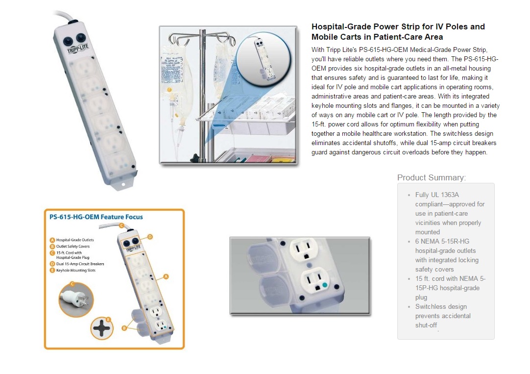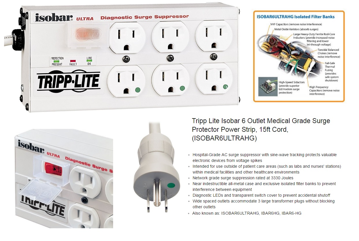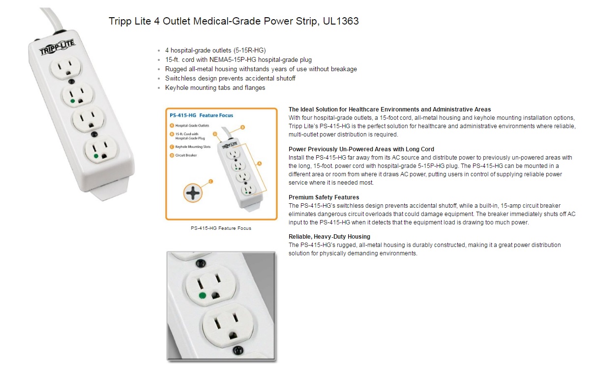 สายไฟเครื่องมือแพทย์ สายปลั๊กไฟสำหรับเครื่องมือแพทย์ เต้ารับไฟฟ้าเครื่องมือแพทย์ และสายพ่วงไฟฟ้าเครื่องมือแพทย์ หัวปลั๊กไฟฟ้าสำหรับเครื่องมือแพทย์ (Green dot) เแบบ NEMA 5-15 สายปลั๊กไฟสำหรับเครื่องมือแพทย์  Power cord medical grade NEMA 5-15 Plug to IEC-320-C13  (Green dot)  ชุดสาย Power cord medical grade NEMA 5-15P to C13 ยาว 1.8 เมตร, 2.4 เมตร, 3 เมตร, 4.5 เมตร, 6 เมตร และ 7.5 เมตร  ชุดสายชนิดทนแรงพิเศษ Heavy duty power cord medical grade NEMA 5-15P to C13 สำหรับเตียงผ่าตัดและเครื่องมือแพทย์อื่นๆ  ชุดสายปลั๊กพ่วงไฟฟ้าสำหรับเครื่องมือแพทย์ ผลิตภัณฑ์ LEVITON อเมริกา Medical Grade Power Strips ความยาวสาย 2.1 เมตร  ชุดสายปลั๊กพ่วงไฟฟ้าสำหรับเครื่องมือแพทย์ ผลิตภัณฑ์  TRIPP-LITE ประเทศ อเมริกา Medical Grade Power Strips ความยาวสาย 4.5 เมตร ชุดสายปลั๊กพ่วงไฟฟ้าสำหรับเครื่องมือแพทย์พร้อมแคล้มยึดติดกับเสาน้ำเกลือ ผลิตภัณฑ์  TRIPP-LITE ประเทศอเมริกา Medical Grade Power Strips with mounting clamp ความยาวสาย 4.5 เมตร และชุดสายพ่วงปลั๊กแบบสายขดสปริงดึงยืดความยาวได้ ต้ารับไฟฟ้าสำหรับเครื่องมือแพทย์ เต้ารับไฟฟ้าสำหรับห้องผ่าตัด เต้ารับไฟฟ้าสำหรับ Celling Pendant เต้ารับไฟฟ้าสำหรับโรงพยาบาล ผลิตภัณฑ์ Hubbell ประเทศ อเมริกา ต้ารับไฟฟ้าแบบ UK แบบ ยุโรป มีระบบเซฟตี้เบรคเกอร์กันไฟดูดในตัว สำหรับโรงพยาบาล Medical AC Plug , Medical Power Cord ,Medical Power Strip ,Medical AC Wall Outlet, Power cable Medical Grade, Hospital grade AC plug ,Medical grade AC power outlet receptacle